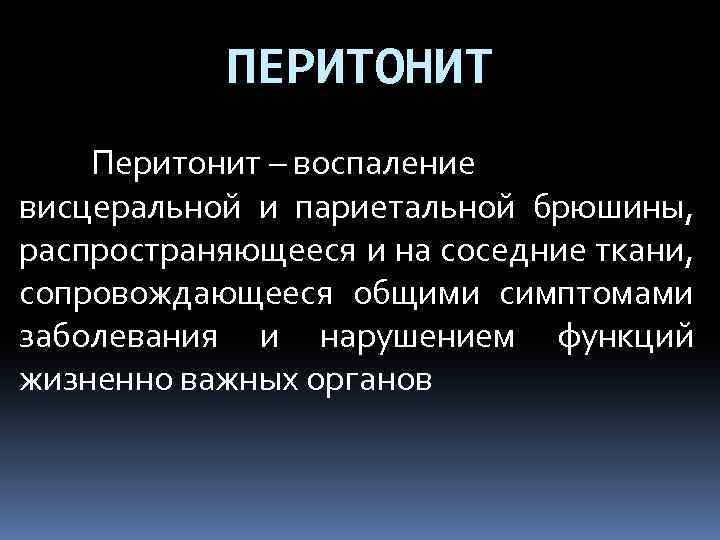 ПЕРИТОНИТ Перитонит – воспаление висцеральной и париетальной брюшины, распространяющееся и на соседние ткани, сопровождающееся общими симптомами заболевания и нарушением функций жизненно важных органов