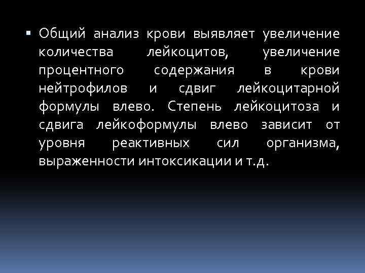 Общий анализ крови выявляет увеличение количества лейкоцитов, увеличение процентного содержания в крови нейтрофилов и сдвиг лейкоцитарной формулы влево. Степень лейкоцитоза и сдвига лейкоформулы влево зависит от уровня реактивных сил организма, выраженности интоксикации и т. д.
