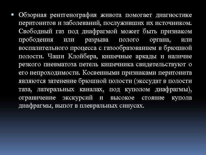 Обзорная рентгенография живота помогает диагностике перитонитов и заболеваний, послуживших их источником. Свободный газ под диафрагмой может быть признаком прободения или разрыва полого органа, или воспалительного процесса с газообразованием в брюшной полости. Чаши Клойбера, кишечные аркады и наличие резкого пневматоза петель кишечника свидетельствуют о его непроходимости. Косвенными признаками перитонита являются затенение брюшной полости (экссудат в полости таза, латеральных каналах, под куполом диафрагмы), ограничение экскурсий и высокое стояние купола диафрагмы, выпот в плевральных синусах.