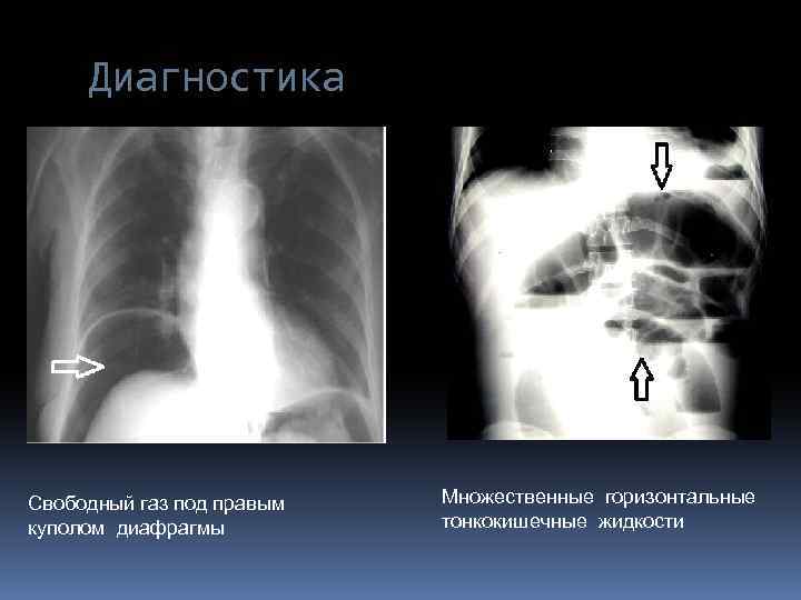 Диагностика Свободный газ под правым куполом диафрагмы Множественные горизонтальные тонкокишечные жидкости