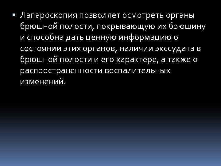 Лапароскопия позволяет осмотреть органы брюшной полости, покрывающую их брюшину и способна дать ценную информацию о состоянии этих органов, наличии экссудата в брюшной полости и его характере, а также о распространенности воспалительных изменений.
