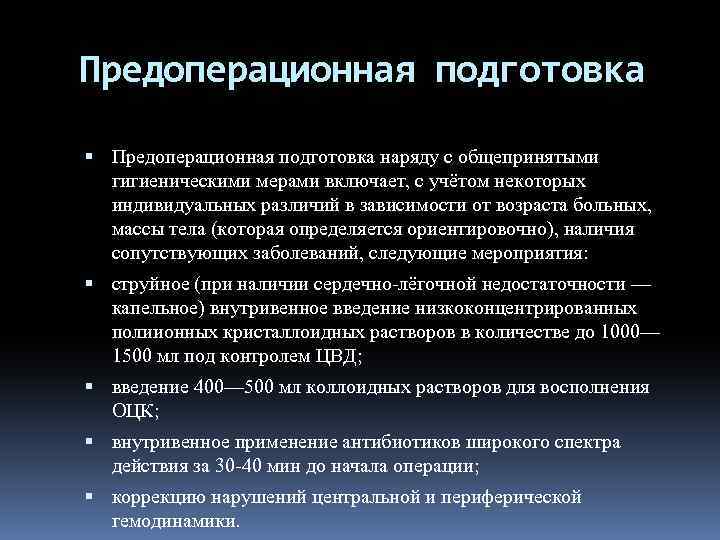 Предоперационная подготовка наряду с общепринятыми гигиеническими мерами включает, с учётом некоторых индивидуальных различий в зависимости от возраста больных, массы тела (которая определяется ориентировочно), наличия сопутствующих заболеваний, следующие мероприятия: струйное (при наличии сердечно-лёгочной недостаточности — капельное) внутривенное введение низкоконцентрированных полиионных кристаллоидных растворов в количестве до 1000— 1500 мл под контролем ЦВД; введение 400— 500 мл коллоидных растворов для восполнения ОЦК; внутривенное применение антибиотиков широкого спектра действия за 30 -40 мин до начала операции; коррекцию нарушений центральной и периферической гемодинамики.