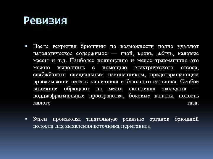Ревизия После вскрытия брюшины по возможности полно удаляют патологическое содержимое — гной, кровь, жёлчь, каловые массы и т. д. Наиболее полноценно и менее травматично это можно выполнить с помощью электрического отсоса, снабжённого специальным наконечником, предотвращающим присасывание петель кишечника и большого сальника. Особое внимание обращают на места скопления экссудата — поддиафрагмальные пространства, боковые каналы, полость малого таза. Затем производят тщательную ревизию органов брюшной полости для выявления источника перитонита.