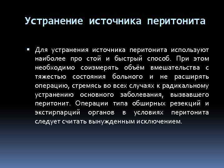 Устранение источника перитонита Для устранения источника перитонита используют наиболее про стой и быстрый способ. При этом необходимо соизмерять объём вмешательства с тяжестью состояния больного и не расширять операцию, стремясь во всех случаях к радикальному устранению основного заболевания, вызвавшего перитонит. Операции типа обширных резекций и экстирпарций органов в условиях перитонита следует считать вынужденным исключением.