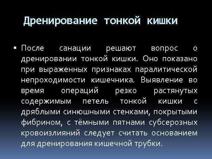 Дренирование тонкой кишки После санации решают вопрос о дренировании тонкой кишки. Оно показано при выраженных признаках паралитической непроходимости кишечника. Выявление во время операций резко растянутых содержимым петель тонкой кишки с дряблыми синюшными стенками, покрытыми фибрином, с тёмными пятнами субсерозных кровоизлияний следует считать основанием для дренирования кишечной трубки.