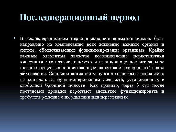 Послеоперационный период В послеоперационном периоде основное внимание должно быть направлено на компенсацию всех жизненно важных органов и систем, обеспечивающих функционирование организма. Крайне важным элементом является восстановление перистальтики кишечника, что позволяет переходить на полноценное энтеральное питание, существенно повышающее шансы на благоприятный исход заболевания. Основное внимание хирурга должно быть направлено на контроль за функционированием дренажей, установленных в свободной брюшной полости. Как правило, через 3 сут после постановки дренажи перестают адекватно функционировать и требуется решение о их удалении или перестановке.