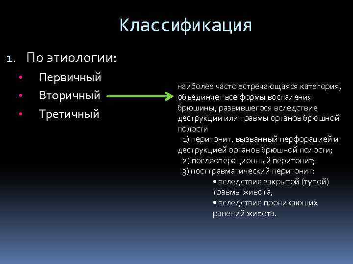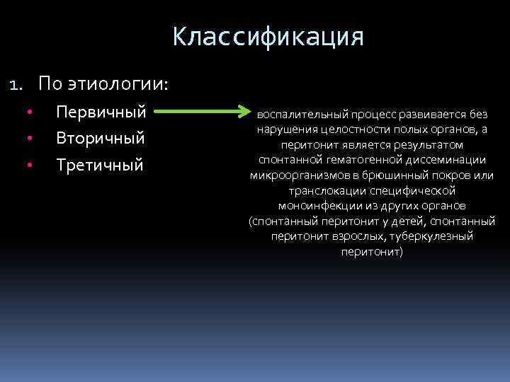 Классификация 1. По этиологии: • • • Первичный Вторичный Третичный воспалительный процесс развивается без нарушения целостности полых органов, а перитонит является результатом спонтанной гематогенной диссеминации микроорганизмов в брюшинный покров или транслокации специфической моноинфекции из других органов (спонтанный перитонит у детей, спонтанный перитонит взрослых, туберкулезный перитонит)