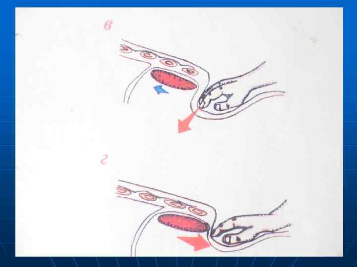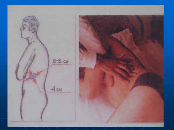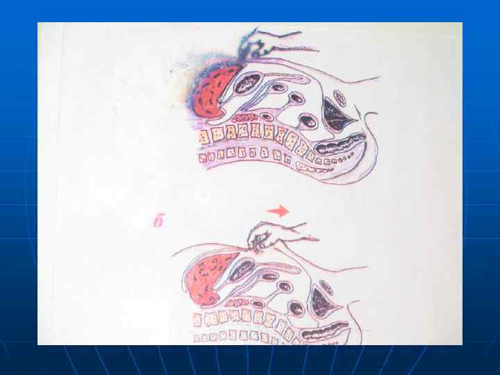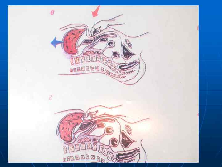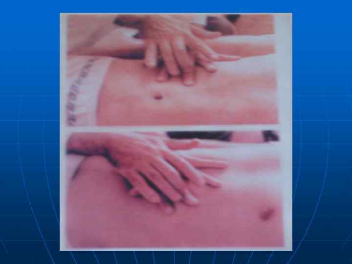 Методика пальпации. n n Больного просят вдохнуть «животом» . Врач пальцами правой руки смещает кожу передней брюшной стенки вниз на 3 -4 см, т. е. в сторону противоположную краю печени. Затем больной делает выдох. Врач, следуя за опускающейся брюшной стенкой , погружает пальцы правой кисти вглубь живота и фиксирует их.