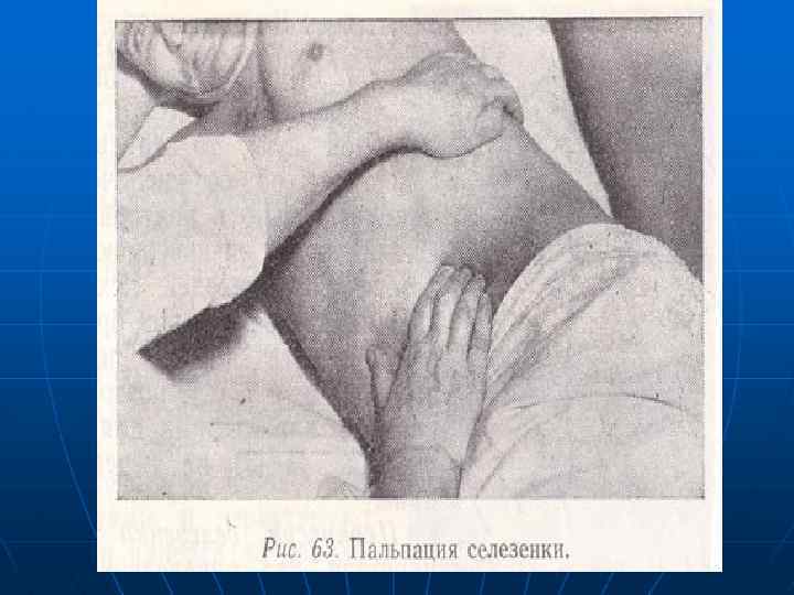 МЕТОДИКА ПАЛЬПАЦИИ. n n Между тылом кисти и реберной дугой должно остаться пространство, достаточное, чтобы пропустить край селезенки. Больного просят вдохнуть «животом» . Врач левой рукой надавливает на реберную дугу, чтобы ограничить ее подвижность. Правая рука стоит неподвижно в глубине живота.