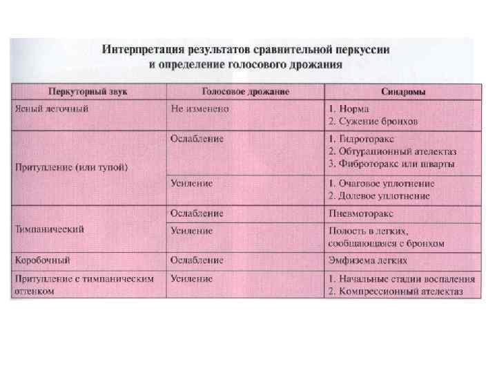 Изменение перкуторного звука в патологии коробочный Металлический Повышение воздушности легкого Тимпанит Нормальная воздушность легкого Ясный легочный Звук тресн. горшка Притупленотимпанический Снижение воздушности легкого Притупленный Безвоздушное легкое Тупой звук