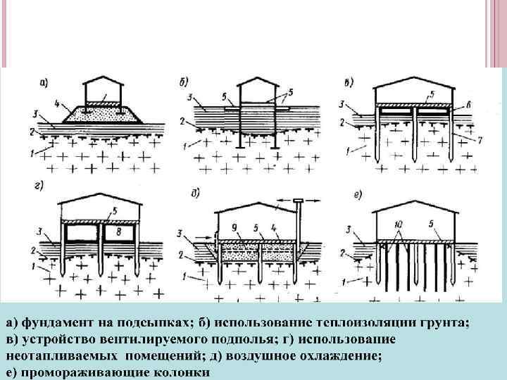 ПРИНЦИПЫ УСТРОЙСТВА ФУНДАМЕНТОВ НА ВЕЧНОМЕРЗЛЫХ ГРУНТАХ Принцип 1. Вечномерзлые грунты основания используются в мерзлом состоянии, сохраняемом в процессе строительства и в течении всего периода эксплуатации сооружения. Принцип 2. Вечномерзлые грунты основания используются в оттаянном или оттаивающем состоянии в период эксплуатации сооружения. Опирание фундаментов происходит на полускальные или другие малосжимаемые грунты.