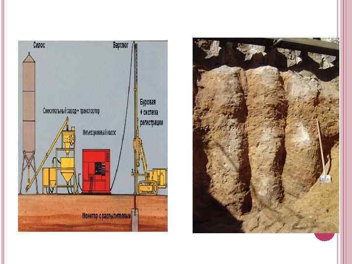 ЦЕМЕНТАЦИЯ Цементация — это процесс нагнетания в грунт жидкого цементного раствора или цементного молока по ранее забитым полым сваям. Когда процесс нагнетания заканчивается, сваи вынимают. Цементация подходит только для уплотнения крупных и средних песков.