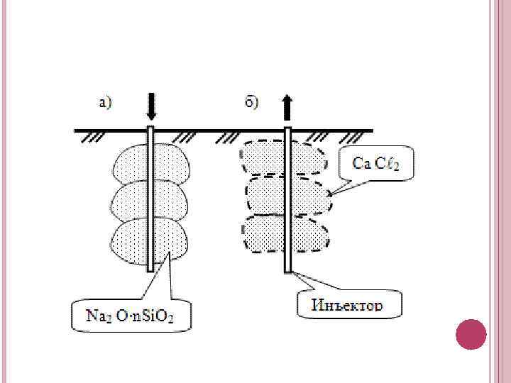 ХИМИЧЕСКИЙ СПОСОБ Химическим способом (силикатизацией) закрепляют песчаные и лёссовые грунты, нагнетая в них химические растворы. Силикатизация производится тем же способом, что и цементация грунта. Для того, чтобы закрепить песок, по трубам нагнетают раствор жидкого стекла и хлористого кальция. При закреплении пылеватых песков используют раствор жидкого стекла, смешанный с раствором фосфорной кислоты, а при закреплении лёссовых грунтов применяют только раствор жидкого стекла. После завершения нагнетания таких растворов грунты каменеют.