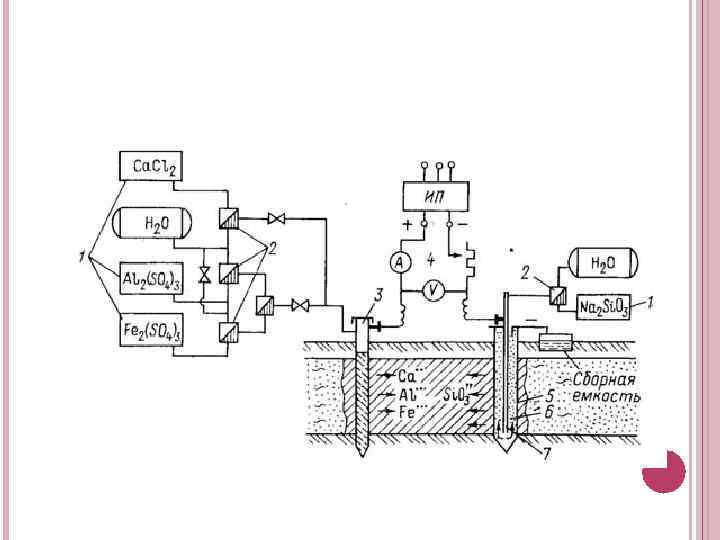 ЭЛЕКТРОХИМИЧЕСКИЙ СПОСОБ Электрохимический способ отличается от предыдущего тем, что одновременно с электрическим током через трубу, являющуюся катодом, в грунт вводят растворы химических добавок (хлористый кальций и др. ). Благодаря этому интенсивность процесса закрепления грунта возрастает.