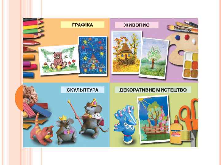 Тематична структура програми “Образотворче мистецтво” (5 -7 кл. ) Кл 5 6 7 Тема року Теми Графіка. Живопис. Скульптура. Види мистецтва Декоративно-прикладне мистецтво. Взаємодія образотворчого мистецтва з іншими видами мистецтва (музика, архітектура, література, театр, цирк, кіно). Анімалістичний жанр. Пейзаж. Портретний жанр. Жанри Побутовий жанр. Натюрморт. образотворчого мистецтва Жанри: міфологічний, релігійний, історичний, батальний. Мистецтво: діалог Мистецтво у нашому житті. традицій і Дизайн. сучасності