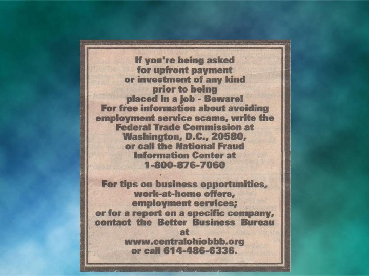 Consumer Protection Agencies to contact (handout page 2) You are a targeted group. Your information is a matter of public record. Better Business Bureau Call before you have work done or have complaints Chamber of Commerce (if no BBB in your city) Federal Trade Commission Fraud, deceptive, unfair business practices and identity theft. (Identity theft only takes a SS#. ) Food & Drug Administration For problems with foods, drugs and cosmetics Federal Communications Commission Misleading or deceptive ads on TV or radio Police to report con-artists or crooks going door-to-door State Attorney General US Post Office If you feel you’ve been defrauded through the mail for problems with items made, sold or advertised within the state.