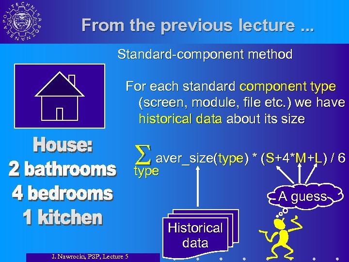From the previous lecture. . . Standard-component method For each standard component type (screen, module, file etc. ) we have historical data about its size aver_size(type) * (S+4*M+L) / 6 type A guess Historical data J. Nawrocki, PSP, Lecture 5