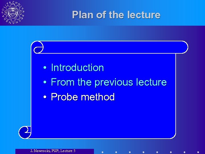 Plan of the lecture • Introduction • From the previous lecture • Probe method J. Nawrocki, PSP, Lecture 5
