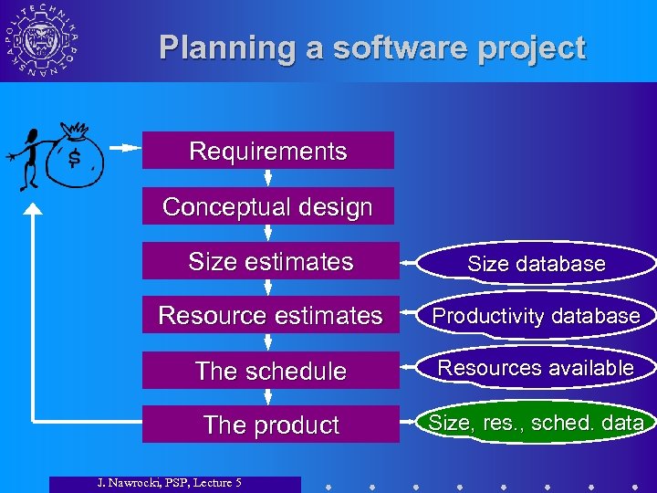 Planning a software project Requirements Conceptual design Size estimates Size database Resource estimates Productivity database The schedule Resources available The product Size, res. , sched. data J. Nawrocki, PSP, Lecture 5