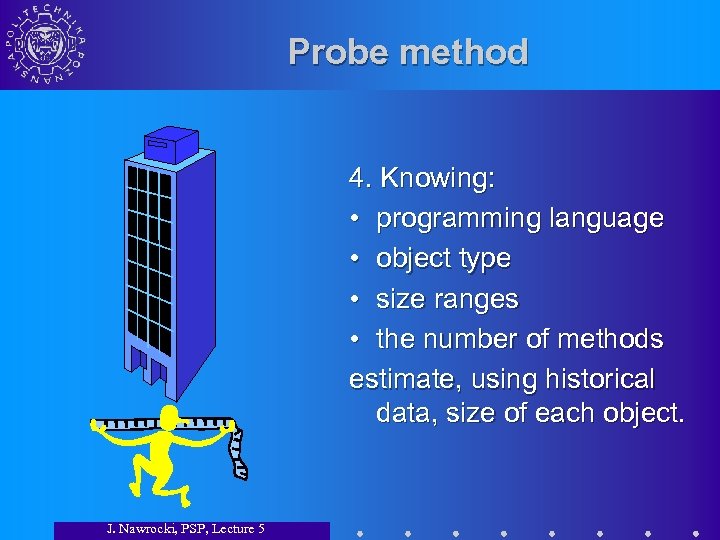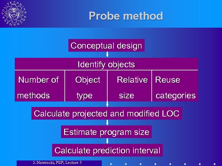 Probe method 4. Knowing: • programming language • object type • size ranges • the number of methods estimate, using historical data, size of each object. J. Nawrocki, PSP, Lecture 5