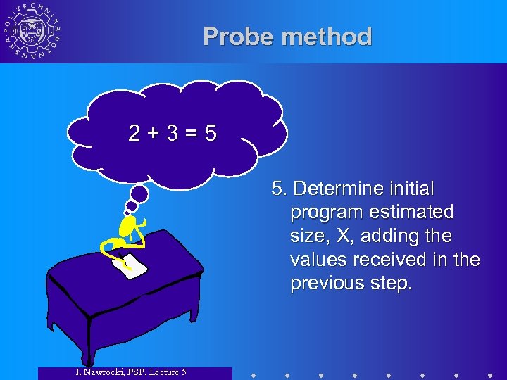 Probe method 2+3=5 5. Determine initial program estimated size, X, adding the values received in the previous step. J. Nawrocki, PSP, Lecture 5