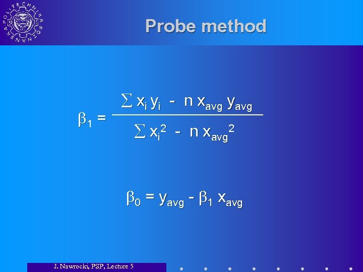 Probe method 1 = xi yi - n xavg yavg xi 2 - n xavg 2 0 = yavg - 1 xavg J. Nawrocki, PSP, Lecture 5