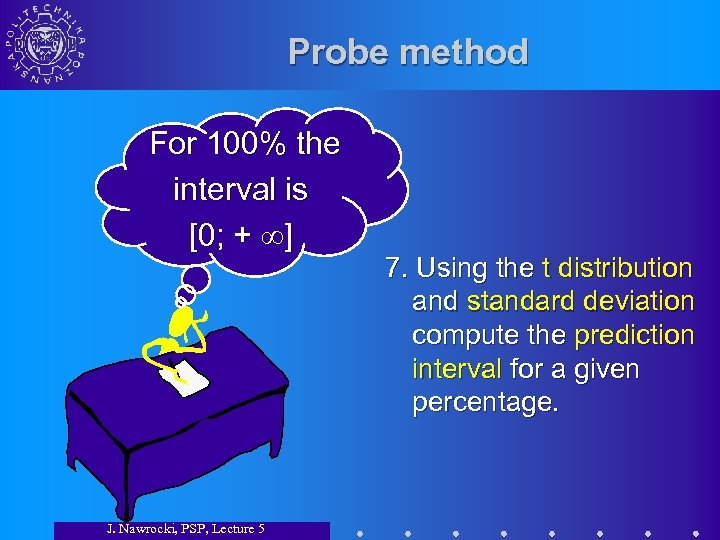 Probe method For 100% the interval is [0; + ] J. Nawrocki, PSP, Lecture 5 7. Using the t distribution and standard deviation compute the prediction interval for a given percentage.