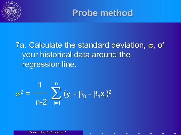 Probe method 7 a. Calculate the standard deviation, , of your historical data around the regression line. 2 = 1 n n-2 (yi - 0 - 1 xi)2 i=1 J. Nawrocki, PSP, Lecture 5