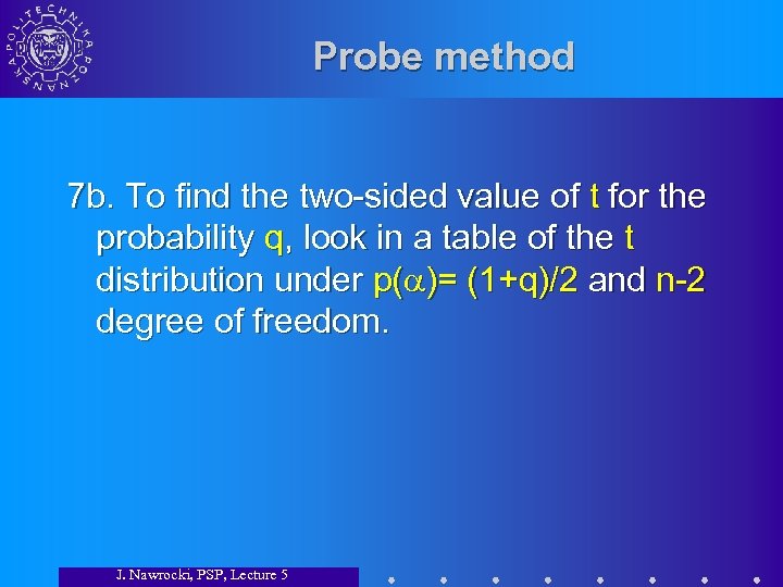 Probe method 7 b. To find the two-sided value of t for the probability q, look in a table of the t distribution under p( )= (1+q)/2 and n-2 degree of freedom. J. Nawrocki, PSP, Lecture 5