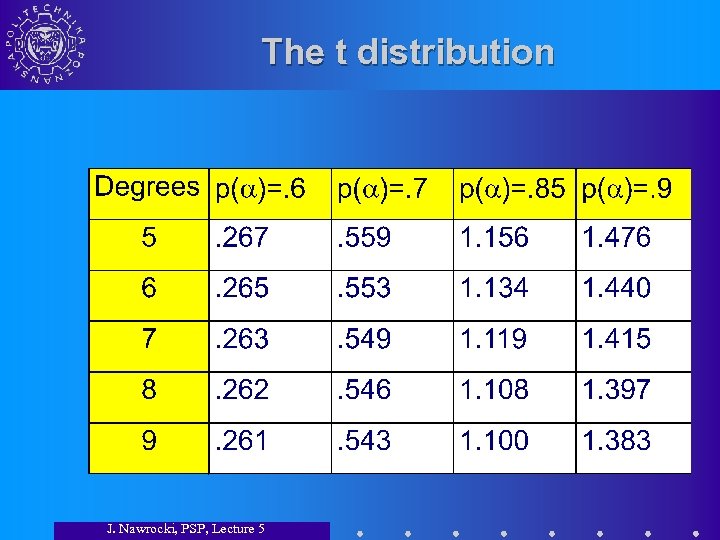 The t distribution J. Nawrocki, PSP, Lecture 5