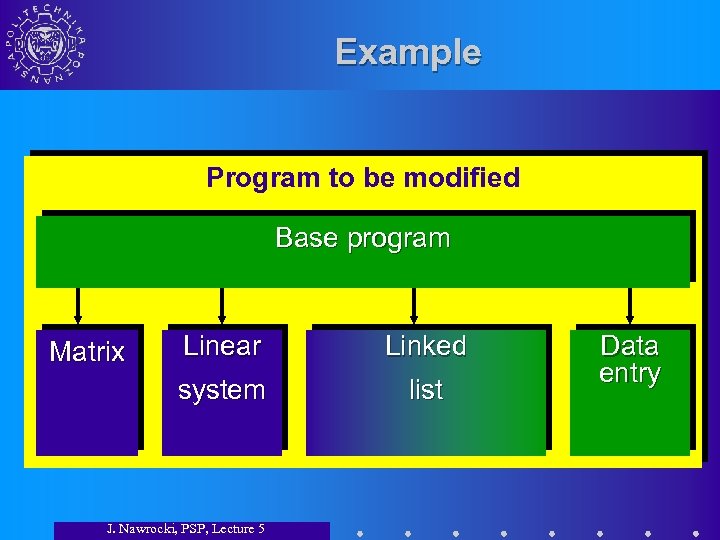 Example Program to be modified Base program Linear Linked system Matrix list J. Nawrocki, PSP, Lecture 5 Data entry