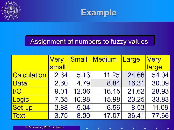 Example Assignment of numbers to fuzzy values J. Nawrocki, PSP, Lecture 5