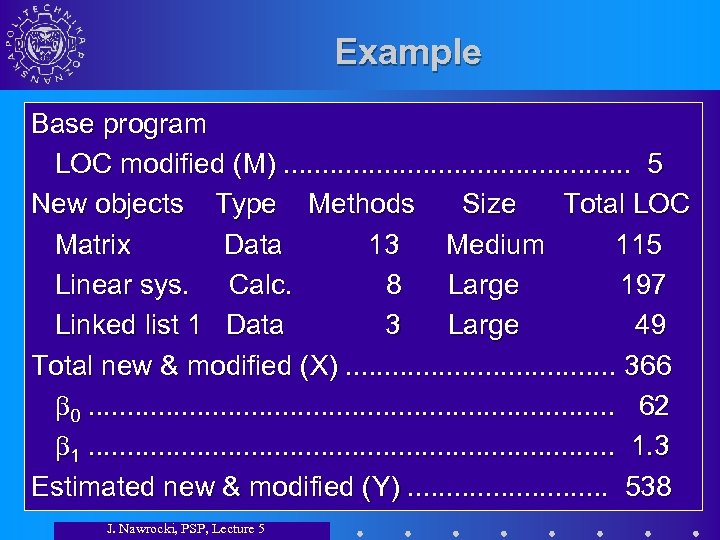 Example Base program LOC modified (M). . . 5 New objects Type Methods Size Total LOC Matrix Data 13 Medium 115 Linear sys. Calc. 8 Large 197 Linked list 1 Data 3 Large 49 Total new & modified (X). . . . . 366 0. . . . . 62 1. . . . . 1. 3 Estimated new & modified (Y). . . 538 J. Nawrocki, PSP, Lecture 5
