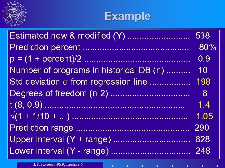 Example Estimated new & modified (Y). . . Prediction percent. . . p = (1 + percent)/2. . . Number of programs in historical DB (n). . Std deviation from regression line. . . . Degrees of freedom (n-2). . . . t (8, 0. 9). . . . (1 + 1/10 +. . ). . . Prediction range. . . Upper interval (Y + range). . . . Lower interval (Y - range). . . . J. Nawrocki, PSP, Lecture 5 538 80% 0. 9 10 198 8 1. 4 1. 05 290 828 248