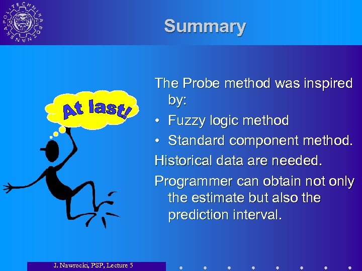 Summary The Probe method was inspired by: • Fuzzy logic method • Standard component method. Historical data are needed. Programmer can obtain not only the estimate but also the prediction interval. J. Nawrocki, PSP, Lecture 5