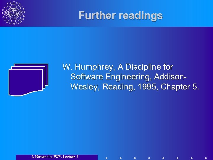 Further readings W. Humphrey, A Discipline for Software Engineering, Addison. Wesley, Reading, 1995, Chapter 5. J. Nawrocki, PSP, Lecture 5
