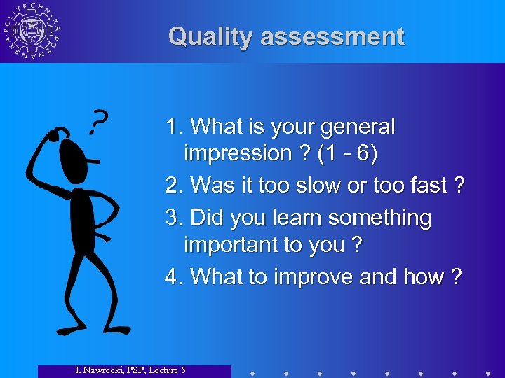 Quality assessment 1. What is your general impression ? (1 - 6) 2. Was it too slow or too fast ? 3. Did you learn something important to you ? 4. What to improve and how ? J. Nawrocki, PSP, Lecture 5