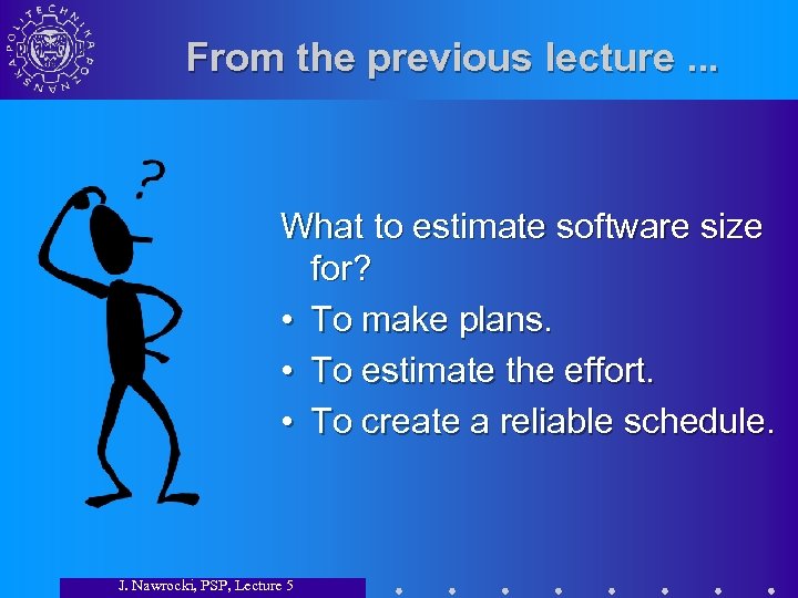 From the previous lecture. . . What to estimate software size for? • To make plans. • To estimate the effort. • To create a reliable schedule. J. Nawrocki, PSP, Lecture 5