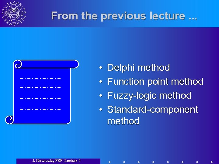 From the previous lecture. . . • • J. Nawrocki, PSP, Lecture 5 Delphi method Function point method Fuzzy-logic method Standard-component method