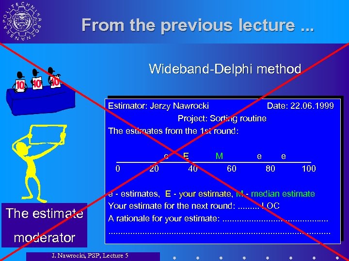 From the previous lecture. . . Wideband-Delphi method Estimator: Jerzy Nawrocki Date: 22. 06. 1999 Project: Sorting routine The estimates from the 1 st round: e 0 The estimate moderator 20 E 40 M e 60 e 80 100 e - estimates, E - your estimate, M - median estimate Your estimate for the next round: . . LOC A rationale for your estimate: . . . . . . . . J. Nawrocki, PSP, Lecture 5