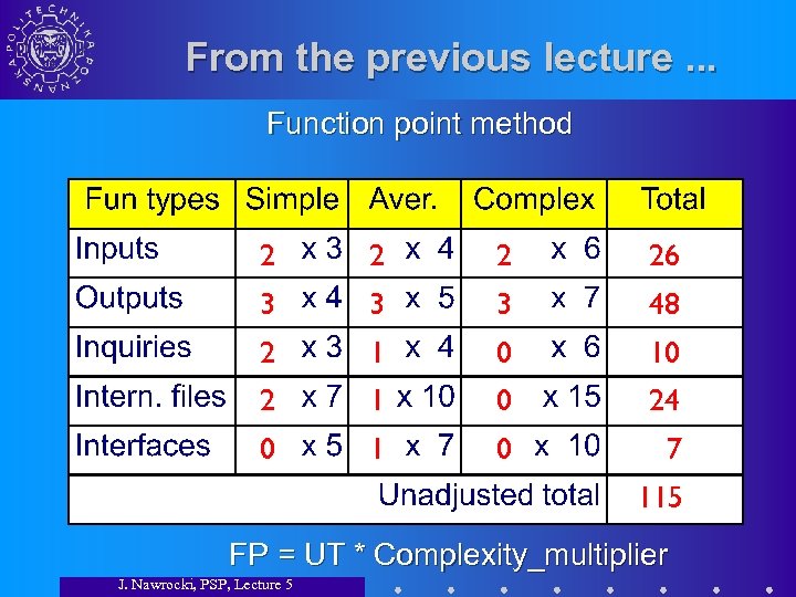 From the previous lecture. . . Function point method 2 26 3 3 3 48 2 1 0 10 2 1 0 24 0 1 0 7 115 FP = UT * Complexity_multiplier J. Nawrocki, PSP, Lecture 5