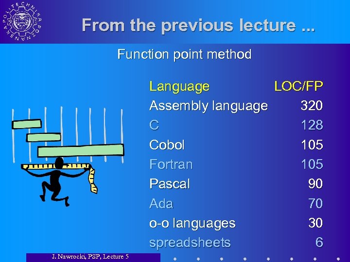 From the previous lecture. . . Function point method Language LOC/FP Assembly language 320 C 128 Cobol 105 Fortran 105 Pascal 90 Ada 70 o-o languages 30 spreadsheets 6 J. Nawrocki, PSP, Lecture 5