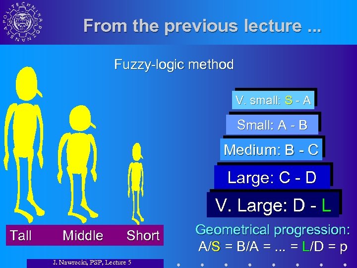 From the previous lecture. . . Fuzzy-logic method V. small: S - A Small: A - B Medium: B - C Large: C - D V. Large: D - L Tall Middle Short J. Nawrocki, PSP, Lecture 5 Geometrical progression: A/S = B/A =. . . = L/D = p
