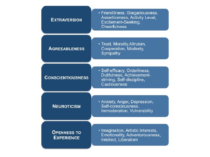 Trait Theory of Personality • MMPI – Minnesota Multiphasic Personality Inventory – most widely researched/used trait personality inventory • Introversion-Extroversion/Emotional Stability Scale (Eysenck) • BIG FIVE Personality Traits: • Big Five Personality test 1. Extraversion (how outgoing or shy one is) 2. Agreeableness (how easy to get along with one is) 3. Conscientiousness (hardworking, responsible, organized) 4. Openness to Experience (creativity, curiosity, etc. ) 5. Neuroticism (Emotional Stability; consistency of mood)