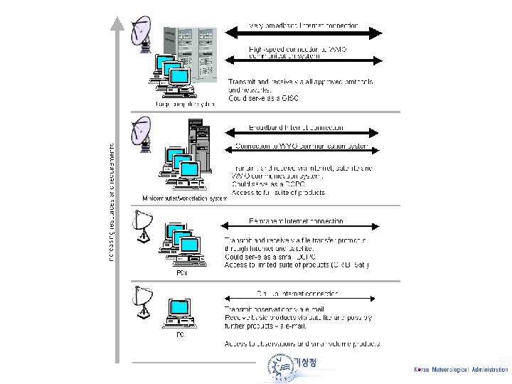 Current KMA status q Internet ü ISP 100 Mbps, HPCNet 2 x 2 Mbps ü KOREN (155 Mbps – 1 Gbps) - APII&TEIN q Satellite communication ü Multi purpose satellite at 2008 ü OBCOM