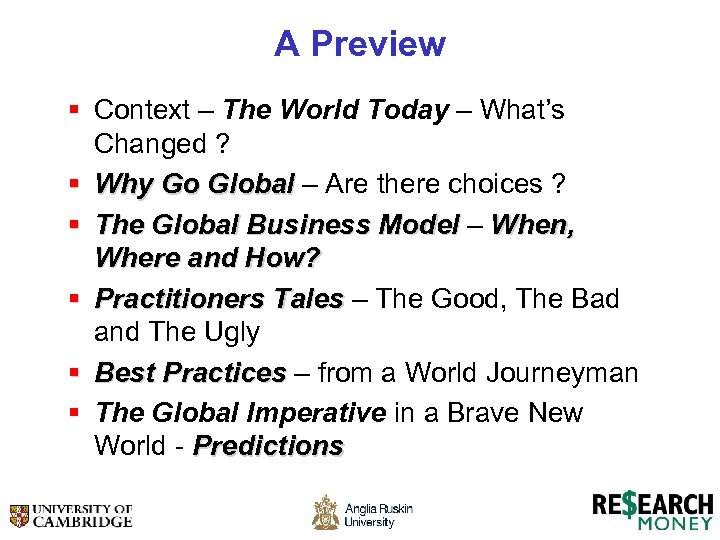 A Preview § Context – The World Today – What’s Changed ? § Why Go Global – Are there choices ? Global § The Global Business Model – When, Model Where and How? § Practitioners Tales – The Good, The Bad Tales and The Ugly § Best Practices – from a World Journeyman Practices § The Global Imperative in a Brave New World - Predictions
