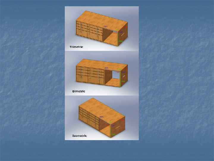 Аксонометрия n n n n Аксонометрическая проекция Аксонометрия (от др. -греч. ἄξων «ось» и др. -греч. μετρέω «измеряю» ) — один из видов перспективы, основанный на методе проецирования (получения проекции предмета на плоскости), с помощью которого наглядно изображают пространственные тела на плоскости бумаги. Аксонометрию иначе называют параллельной перспективой. Как и обратная перспектива, она долгое время считалась несовершенной и, следовательно, аксонометрические изображения воспринимались как ремесленный, простительный в далекие эпохи способ изображения, не имеющий серьёзного научного обоснования. Однако при передаче видимого облика близких и небольших предметов наиболее естественное изображение получается именно при обращении к аксонометрии. Аксонометрия делится на три вида: изометрию (измерение по всем трем координатным осям одинаковое); диметрию (измерение по двум координатным осям одинаковое, а по третьей — другое); триметрию (измерение по всем трем осям различное). В каждом из этих видов проецирование может быть прямоугольным и косоугольным. Аксонометрия широко применяется в изданиях технической литературы и в научнопопулярных книгах благодаря своей наглядности.