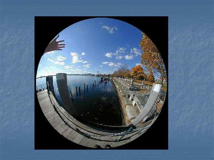 Сферическая перспектива n n Сферическая перспектива сделанная объективом «рыбий глаз» . Сферические искажения можно наблюдать на сферических зеркальных поверхностях. При этом глаза зрителя всегда находятся в центре отражения на шаре. Это позиция главной точки, которая реально не привязана ни к уровню горизонта, ни к главной вертикали. При изображении предметов в сферической перспективе все линии глубины будут иметь точку схода в главной точке и будут оставаться строго прямыми. Также строго прямыми будут главная вертикаль и линия горизонта. Все остальные линии будут по мере удаления от главной точки все более изгибаться, трансформируясь в окружность. Каждая линия, не проходящая через центр, будучи продлённой, является полуэллипсом.