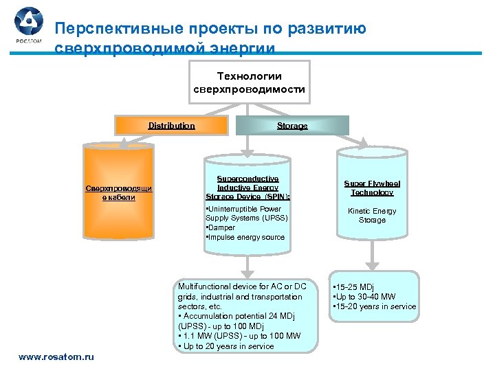 Перспективные проекты по развитию сверхпроводимой энергии Технологии сверхпроводимости Distribution Сверхпроводящи е кабели Storage Superconductive Inductive Energy Storage Device (SPIN): • Uninterruptible Power Supply Systems (UPSS) • Damper • Impulse energy source Multifunctional device for AC or DC grids, industrial and transportation sectors, etc. • Accumulation potential 24 MDj (UPSS) - up to 100 MDj • 1. 1 MW (UPSS) - up to 100 MW • Up to 20 years in service www. rosatom. ru Super Flywheel Technology Kinetic Energy Storage • 15 -25 MDj • Up to 30 -40 MW • 15 -20 years in service