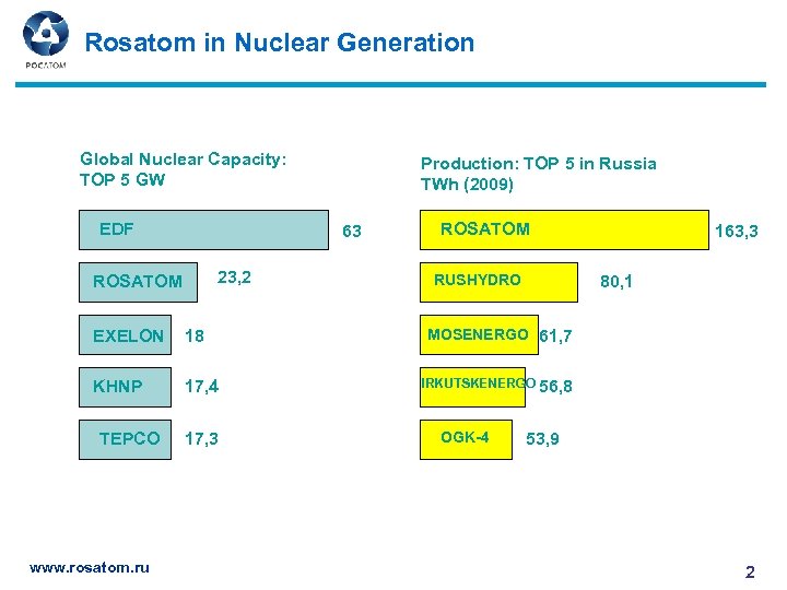 Rosatom in Nuclear Generation Global Nuclear Capacity: TOP 5 GW EDF 63 23, 2 ROSATOM EXELON 18 KHNP 17, 4 TEPCO www. rosatom. ru Production: TOP 5 in Russia TWh (2009) 17, 3 ROSATOM RUSHYDRO 163, 3 80, 1 MOSENERGO 61, 7 IRKUTSKENERGO 56, 8 OGK-4 53, 9 2